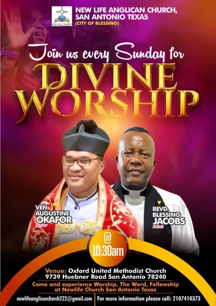 Home Address:9739 Huebner Road San Antonio Texas 78240 Telephone: 2107410373 Email newlifeanglicanchurch222@gmail.com